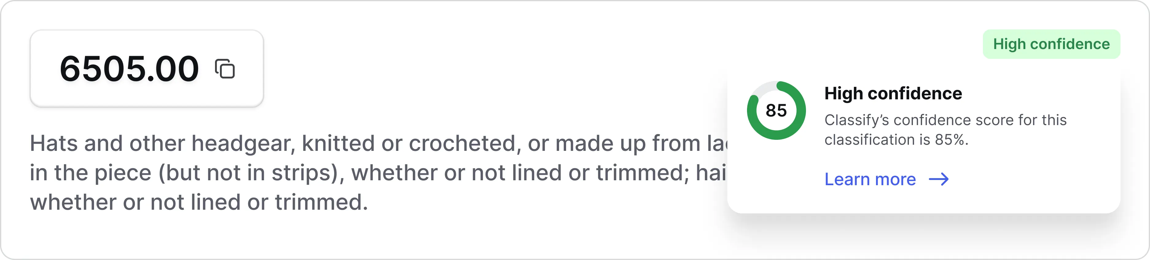 While Classify has a default confidence score, you can adjust the score to suit your business needs. If the confidence score is less than your desired percentage, Classify will not return an HS code. Instead, it will notify you an HS code could not be found and prompt you to add more product information.