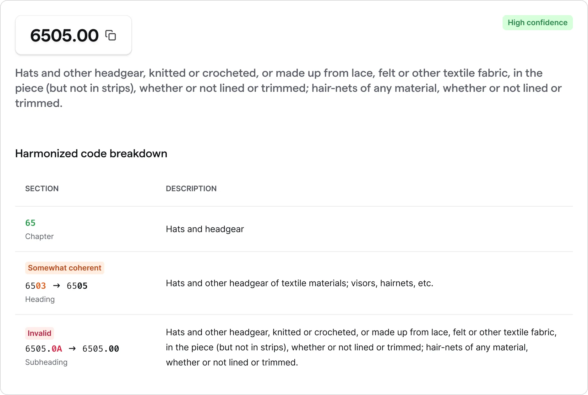 If Classify deems the provided HS code “coherent”, it will return the provided HS code as Classify’s response. If Classify determines the provided HS code “somewhat coherent” or “not coherent”, Classify ignores the provided HS code and classifies from scratch. In either case, Classify will return the coherency status.