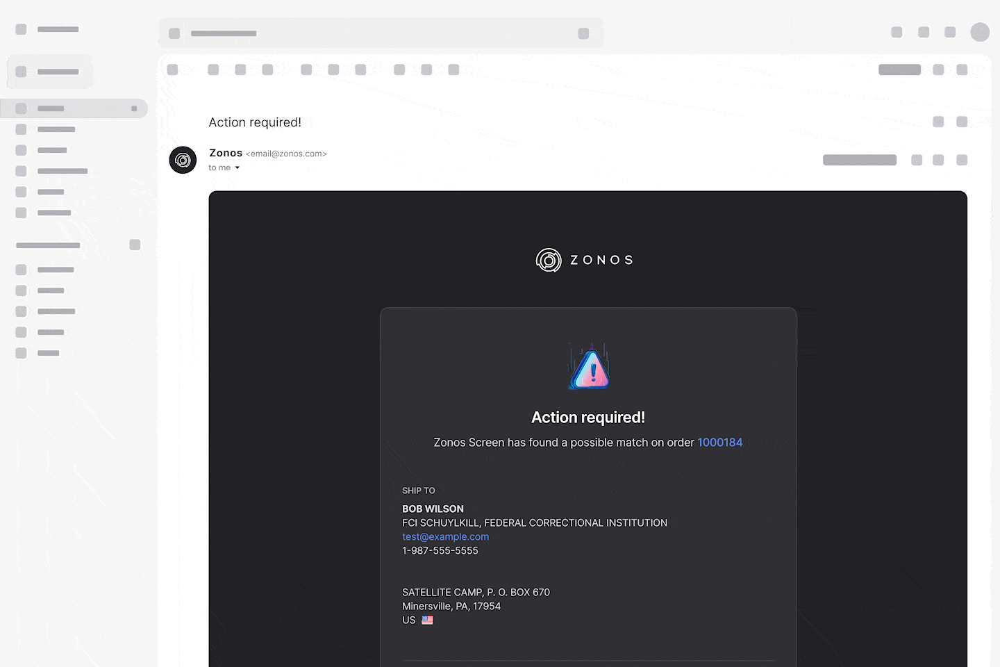 When a possible match is found on a Zonos Checkout order, Zonos will notify you via email.